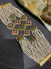 A celebration of timeless Indian artistry, this handcrafted bracelet blends classic elegance with royal charm. Designed with multiple strands of lustrous white seed pearls, it features intricately set green enamel (meenakari-style) motifs adorned with rich red kundan stones and gold-toned detailing.