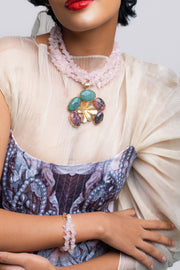 Celebrate the delicate and feminine that exudes softness and elegance within you. This statement necklace is made of natural stones like Rhodonite and chrysoprase. Maala used rose quartz uncut.